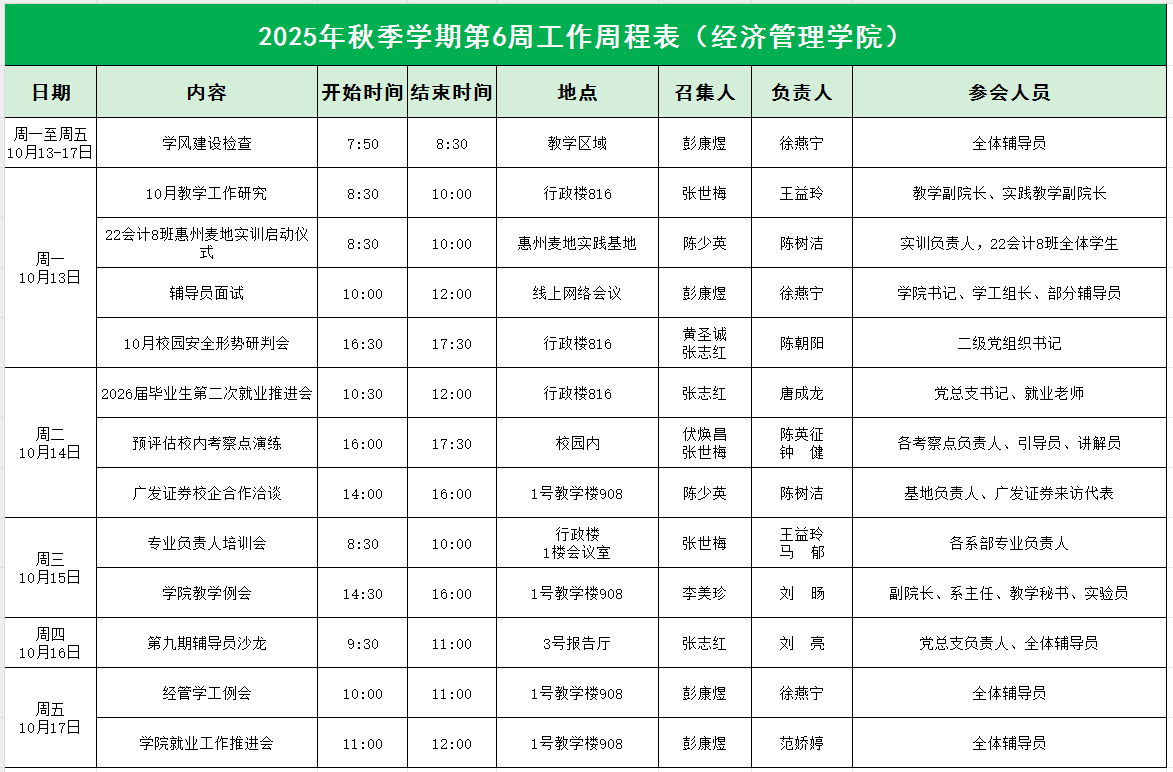 经济管理学院2025年秋季学期第6周工作周程表