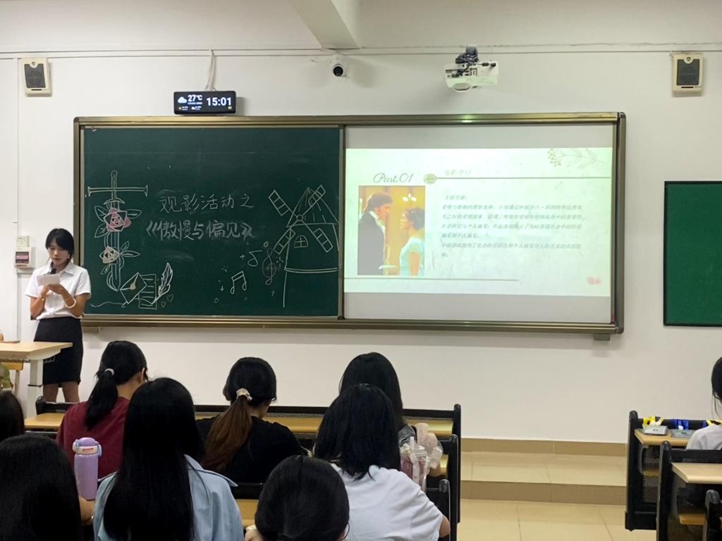 本次活动通过电影介绍、沉浸式观影、问答互动、人物性格赏析以及经典语句分享五个环节,引导同学们深入探讨电影与文学之间的对话,在达西与伊丽莎白的爱情史诗中寻找经典文学的当代回响。