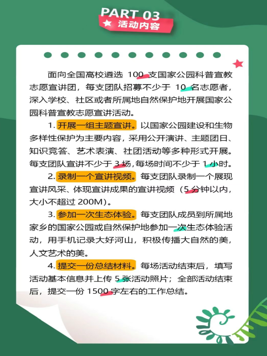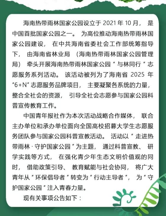 (通讯员:王铭珠、范晓殷)志愿传温情,科普助生态——关于“国家公园大学生科普宣教志愿行动”。该行动由国家公园主管部门与中国青年报等单位联合发起,旨在鼓励广大青年学子走进国家公园,参与生物多样性保护与科普宣教工作,为建设美丽中国贡献青春力量。