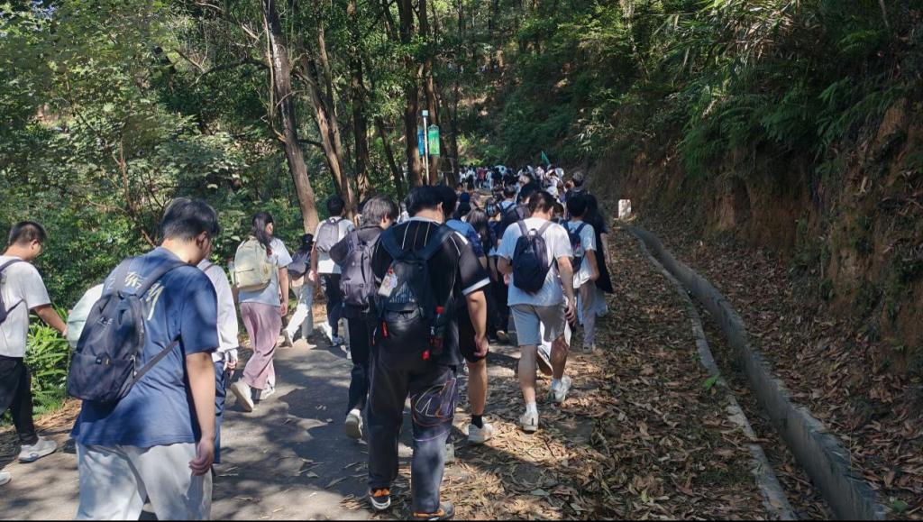 经过近两个小时的徒步攀登,大部分同学都成功抵达帽峰山顶峰。站在山顶远眺,广州城区风貌与山间美景尽收眼底,大家纷纷拿出相机横拍留念,定格下这一成就感满满的瞬间。休息片刻后,同学们有序整理好随身物品,自觉清理周边垃圾,以实际行动践行文明出游理念,带着满满的收获与喜悦踏上返程之路。