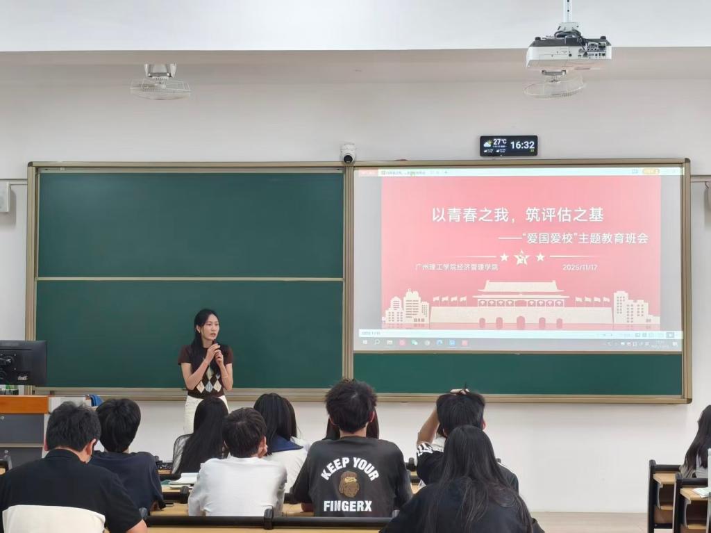 (通讯员:尹昕愉、韦欣)为厚植青年学子家国情怀,强化责任担当意识,引导广大学生将个人成长轨迹与祖国发展进程、学校建设蓝图紧密相连,2025年11月17日下午16:30,经济管理学院于1栋教学楼有序组织开展“以青春之我,筑评估之基”爱国爱校主题班会。本次主题班会由各班班导师精心主持,经济管理学院2025级全体学生全员参会,共同开启一场关于热爱与担当的思想共鸣之旅。