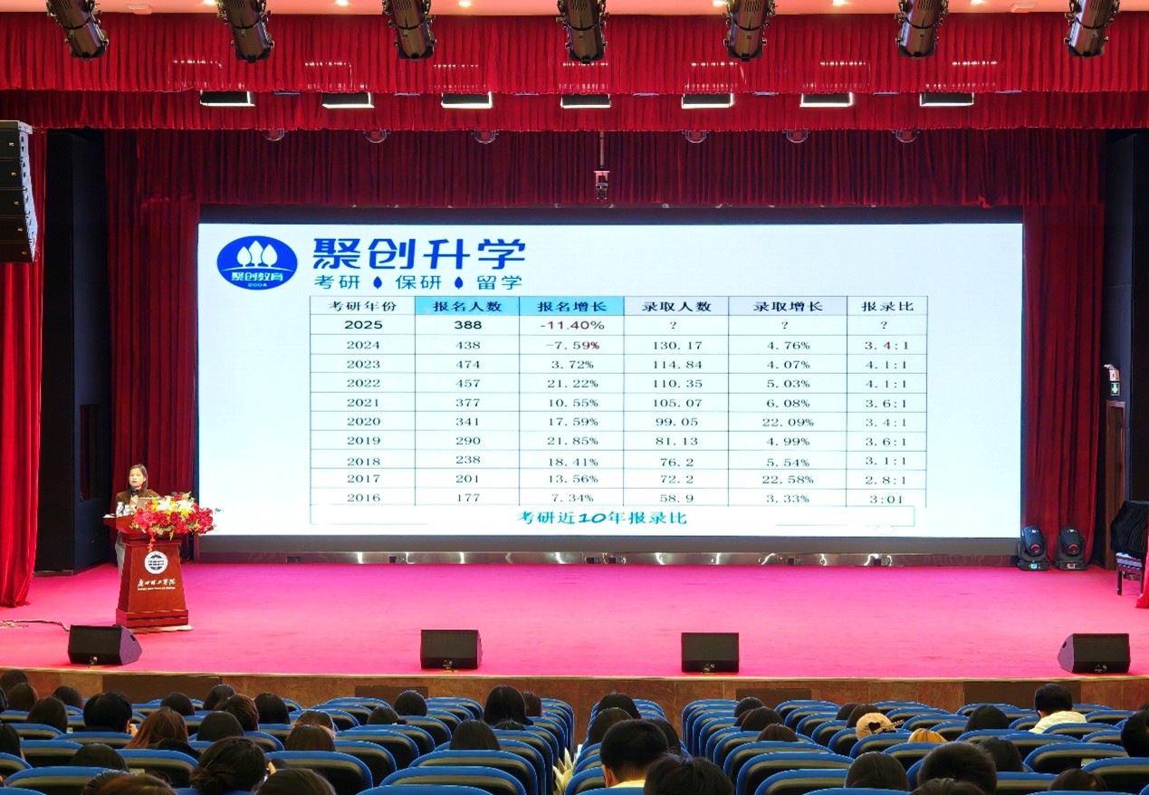 (通讯员:张尔阳)在考研竞争日益激烈的当下,科学规划与精准指导成为了每一位考研学子通往成功之路的重要基石。为帮助经济管理学院的同学们更好地把握考研动态,明确备考方向,提升备考效率,学院特邀业界知名的考研指导专家——聚创教育周川老师,为同学们带来一场精彩纷呈的考研专题讲座。周川老师作为聚创考研填报组副组长指导金牌顾问,拥有丰富的考研规划与指导经验,她的到来无疑为同学们的考研之路点亮了一盏明灯。