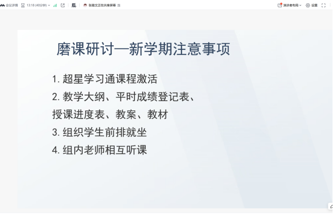 针对新学期教学工作,会议提出多项注意事项:要求及时激活超星学习通课程,确保线上教学资源的有效利用;统一教学大纲、平时成绩登记表、授课进度表、教案及教材等教学文件;推行学生前排就坐制度,以提升课堂互动效果;鼓励组内老师相互听课,促进教学经验交流。
