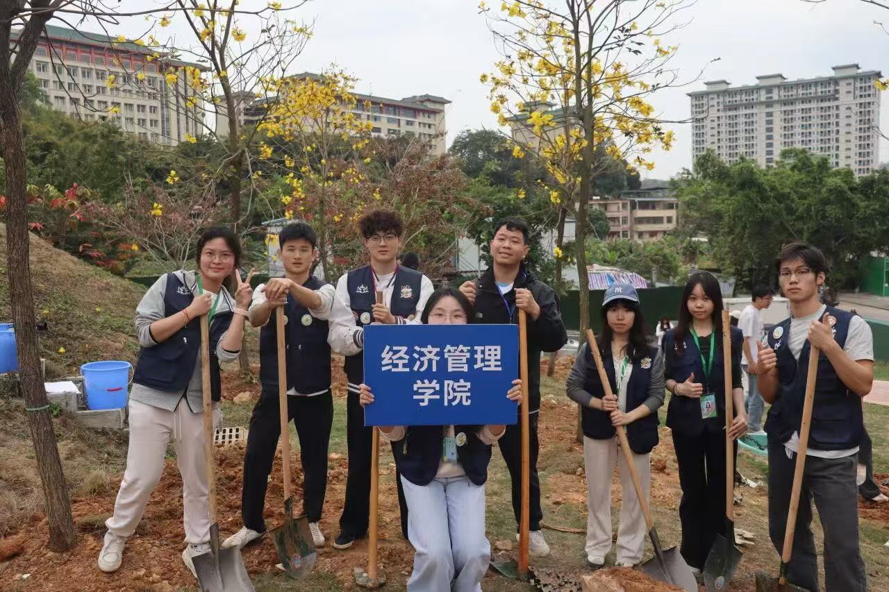 揭牌仪式后,植树环节正式启动。在经济管理学院党总支书记彭康煜,团总支书记杨楚钰的带领下,学院青年学子们与各单位代表分工协作、默契配合——扶苗、培土、浇水,每一道工序都一丝不苟,用双手种下一棵棵充满生机的树苗,也种下了对绿水青山的美好期盼。