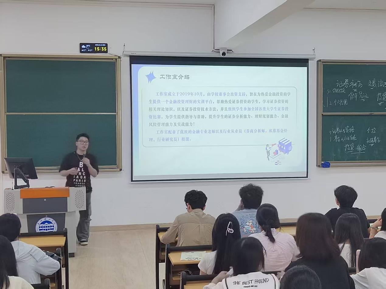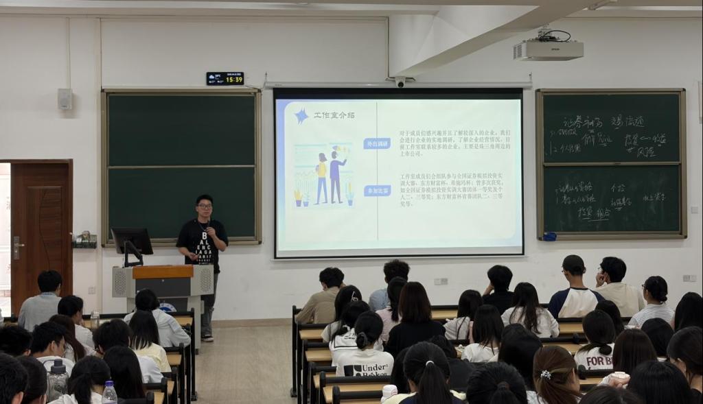 讲座结束后,证券分析先锋工作室的2026校园招新宣讲在热烈的氛围中展开。证券分析先锋工作室负责人陈秦鹏向在场学生详细介绍了工作室的核心内容与多年积累的成果作为成立于2019年10月的校级重点实训平台,证券分析先锋工作室由学校董事会出资支持,配备了优质的金融专业老师以及来自券商、私募基金等行业的从业员作为授课嘉宾,致力于培养具备证券分析能力、理财规划能力、金融风险管理能力及实战能力的复合型金融人才。