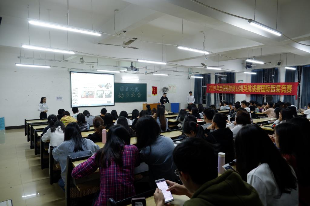 (通讯员 张建龙)11月27日晚,为进一步加快推动应用型、复合型和创新型人才的培养,我院于7栋118举行2019年全国高校商业精英挑战赛国际贸易竞赛动员会。我院实验实训中心主任张建龙、大赛指导老师陈少英、许旭以及上届国赛选手许嘉宁、曾楚欣出席并讲话,我院100余名2016级各班学生代表参加了本次动员会。