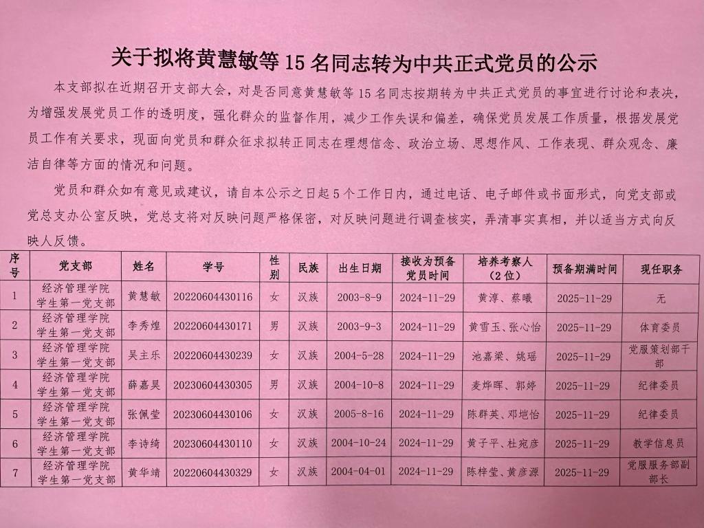 本支部拟在近期召开支部大会,对是否同意黄慧敏等15名同志按期转为中共正式党员的事宜进行讨论和表决,为增强发展党员工作的透明度,强化群众的监督作用,减少工作失误和偏差,确保党员发展工作质量,根据发展党员工作有关要求,现面向党员和群众征求拟转正同志在理想信念、政治立场、思想作风、工作表现、群众观念、廉洁自律等方面的情况和问题。