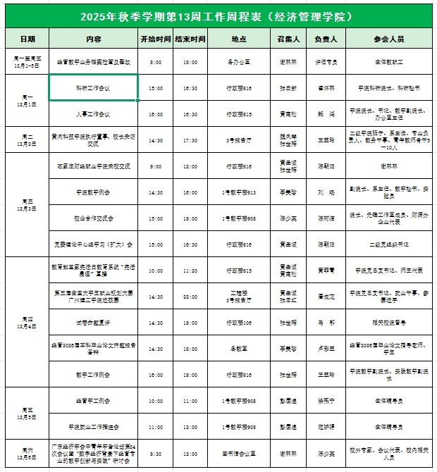 经济管理学院2025年秋季学期第13周工作周程表