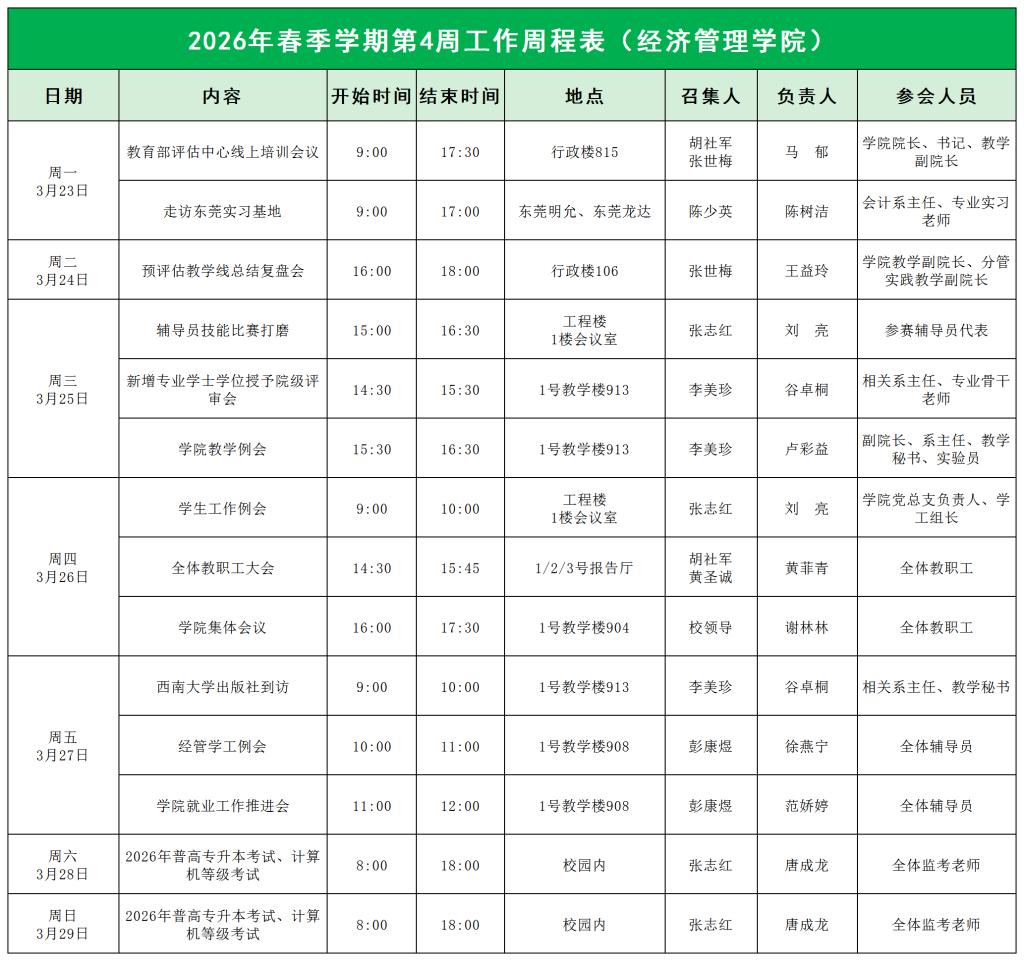 经济管理学院2026年春季学期第4周工作周程表