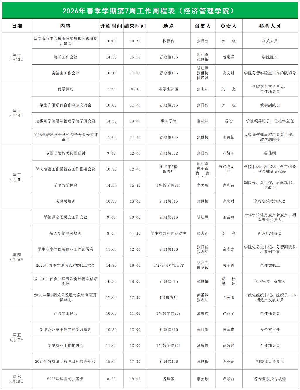 经济管理学院2026年春季学期第7周工作周程表