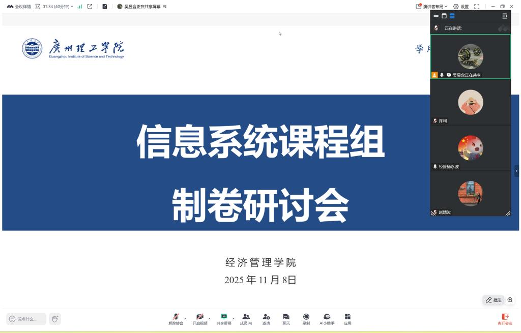 (通讯员:吴昱含)为贯彻落实学校与学院关于期末命题工作的规范要求,确保期末考试命题的科学性、规范性与安全性,信息系统课程组于2025年11月8日晚在腾讯会议组织召开制卷专题研讨会。会议由课程组组长吴昱含主持,人工智能概论与GPT应用课程任课教师杨永波老师、计算机财务管理课程任课教师许利老师及原任课教师赵婧汝老师共同参会。