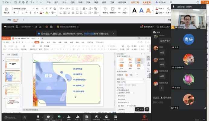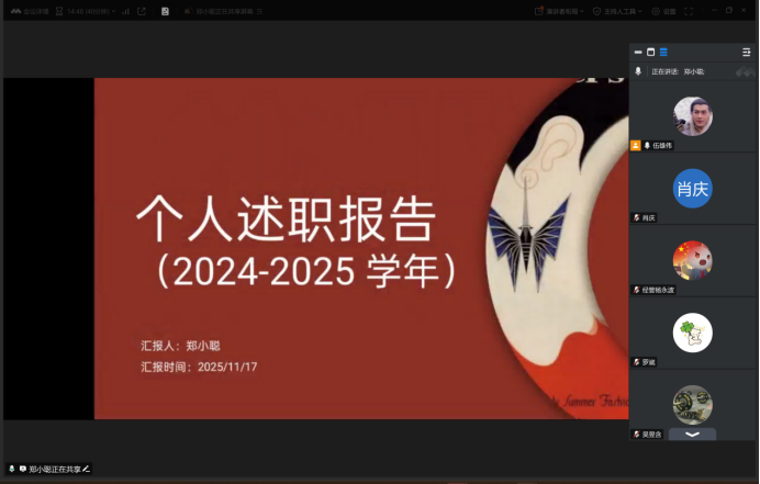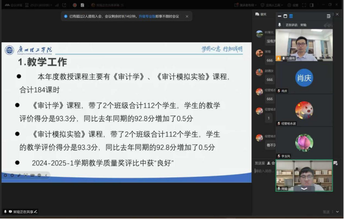 为全面总结2024-2025学年财管系在师德建设、教学科研、学科竞赛指导与社会服务等方面的工作成效,客观评价教师履职表现,经济管理学院财管系于2025年11月17日晚上通过线上会议成功召开全体教师述职大会。会议由财管系主任伍雄伟主持,经济管理学院党总支副书记彭康煜、副院长陈少英出席并担任评议小组成员,财管系全体教师参会。