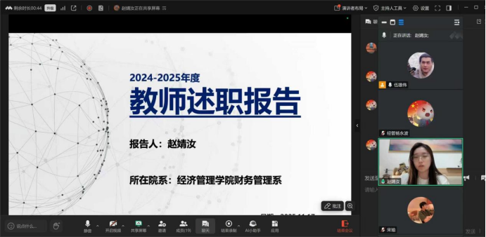 随后,财管系全体教师依次进行个人述职汇报。大家围绕师德师风、教学工作、科研进展、学科竞赛、行政工作、社会服务与对外交流等多个方面,系统梳理了过去一年的工作实绩,深入剖析了存在的问题,并提出了切实可行的改进措施与未来规划。述职过程严谨务实,充分展现了财管系教师队伍的专业素养与敬业精神。