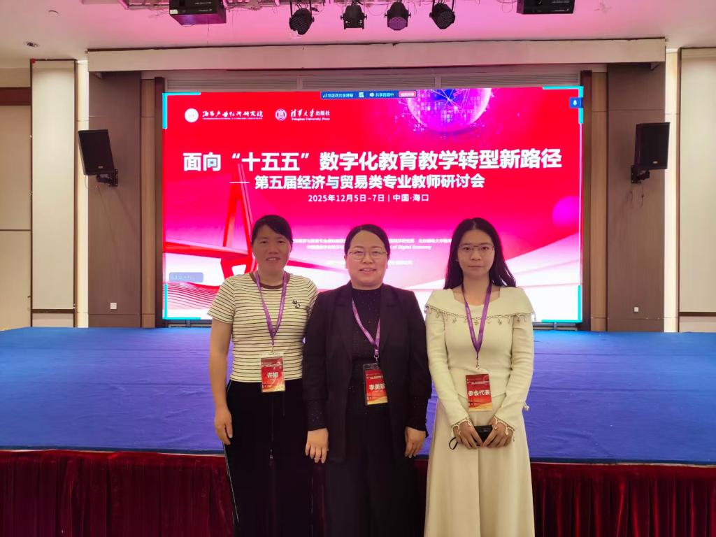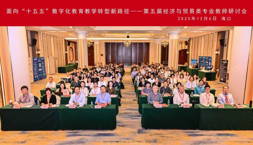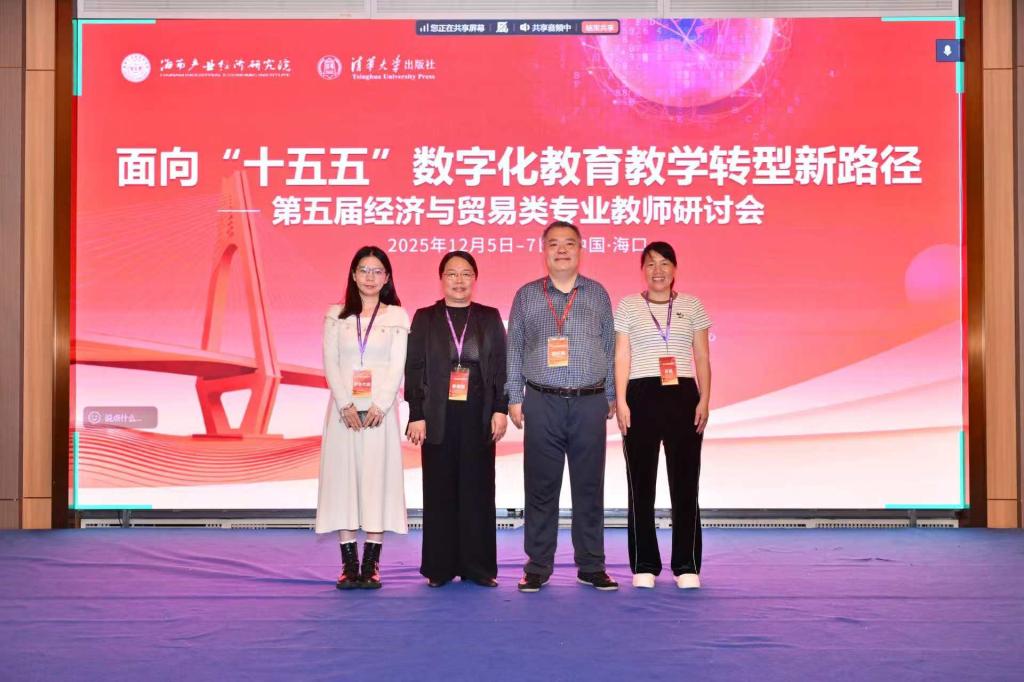 为精准对接“十五五”教育数字化转型战略要求,助力我院国际经济与贸易专业(以下简称“国贸专业”)教学改革与人才培养提质升级,12月5日至7日,“面向‘十五五’数字化教育教学转型新路径——第五届经济与贸易类专业教师研讨会”在海南海口成功举办。本次研讨会由海南产业经济研究院、清华大学出版社联合主办,教育部国际经济与贸易专业虚拟教研室等三家单位指导,聚焦数字经贸人才培养、教学资源建设、实践教学创新等核心议题,汇聚全国高校及行业专家深度研讨。我院李美珍院长带队,左丹、许旭两位教师代表全程参会,深度参与学术交流与实地调研,为专业建设汲取前沿经验。