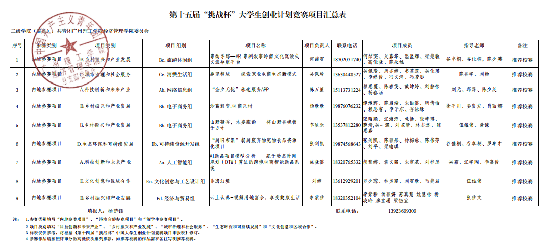根据《关于举办第十五届“挑战杯”广东大学生创业计划竞赛校内选拔赛的通知》相关要求,经济管理学院积极组织学生参与,各班级踊跃上交申报作品。经过组织初审——班赛推优——学院评审等环节,最终从93份作品中选拔出以下9份作品推荐参加校赛。现将推荐参加校赛作品名单及相关信息进行公示。