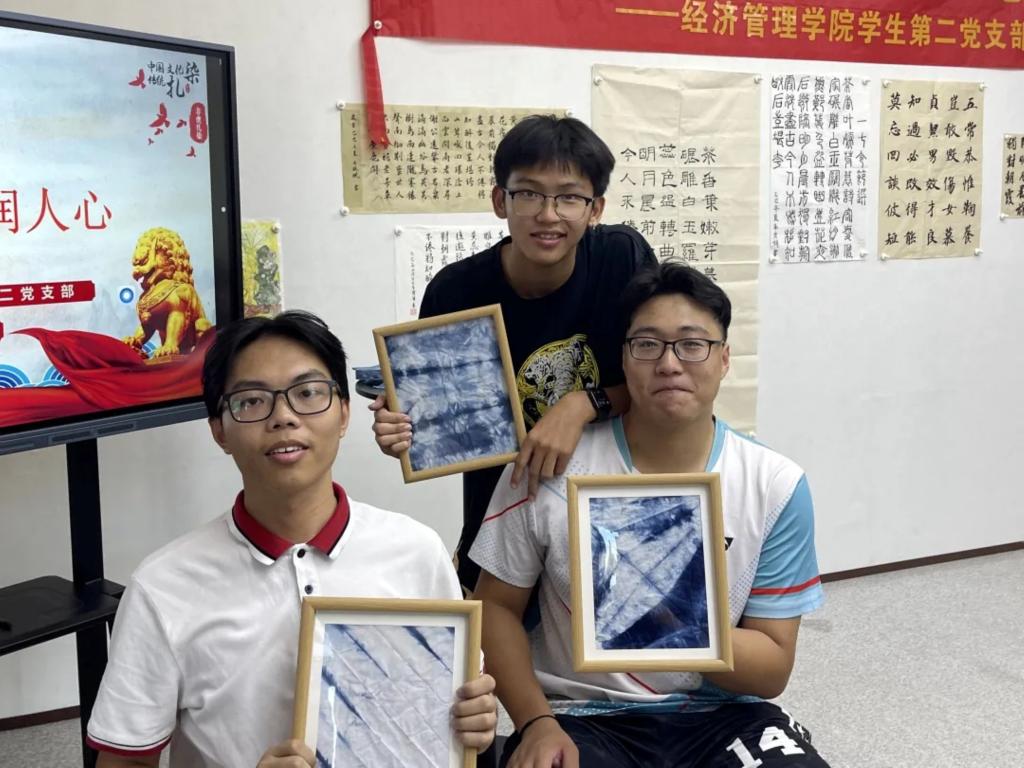 活动最后,全体学生手执亲手染制的扎染作品,在“一站式”学生第九社区合影留念。蓝白相间的织物与灿烂的笑容交相辉映,展现了新时代青年对红色基因的生动传承。这场别开生面的扎染体验,不仅是对传统工艺的生动实践,更是一次涤荡心灵的党性教育课,既提升了学生们的审美素养,也增强了基层党组织的凝聚力。传承不息,创新不止。经济管理学院学生党支部将继续探索“党建+非遗”新模式,让红色党旗在文化传承一线高高飘扬!