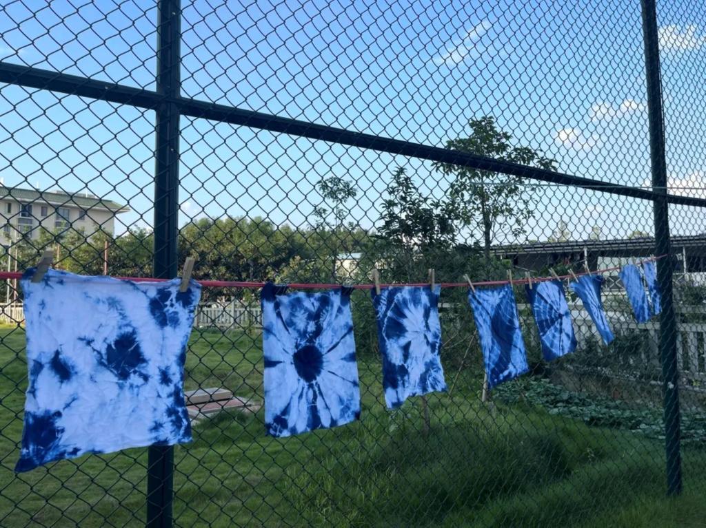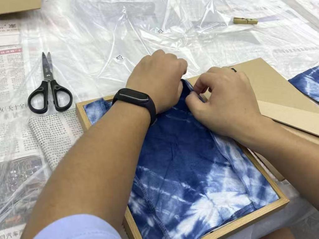 扎染是一门历史悠久的织物染色技艺,承载着深厚的民间智慧与文化记忆。它以线绳为笔,以布为卷,通过捆扎、缝合、夹压等手法,在布帛上创造出千变万化的纹理与图案。活动伊始,支部负责人为大家播放视频,让大家了解扎染的发展脉络以及扎结的技巧与染色的时间等内容。学生们认真观看,对即将动手体验的环节充满期待。视频播放结束后,大家自由发挥,通过不同的捆扎方式与染色层次,创作出一件件纹样别致、色彩斑斓的扎染作品,每一幅都蕴含着亲手制作的温度与美感。