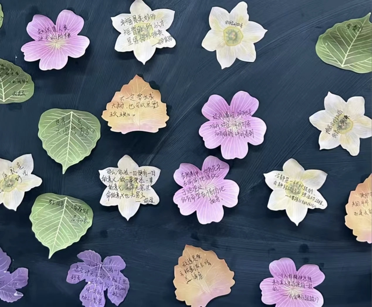 进入书籍分享与交流环节,现场气氛热烈非凡:同学们手持便签纸,在“阅读漂流卡”上写下对书籍的感悟,红色字迹如跳跃的火焰,在卡片上汇聚成对文字的热爱,不同思想在教室里碰撞出清脆的回响,爆发出对生命意义的热烈探讨……黑板旁的“书香树”渐渐被手写的读书心得卡片挂满,成为连接书籍与青春的纽带。