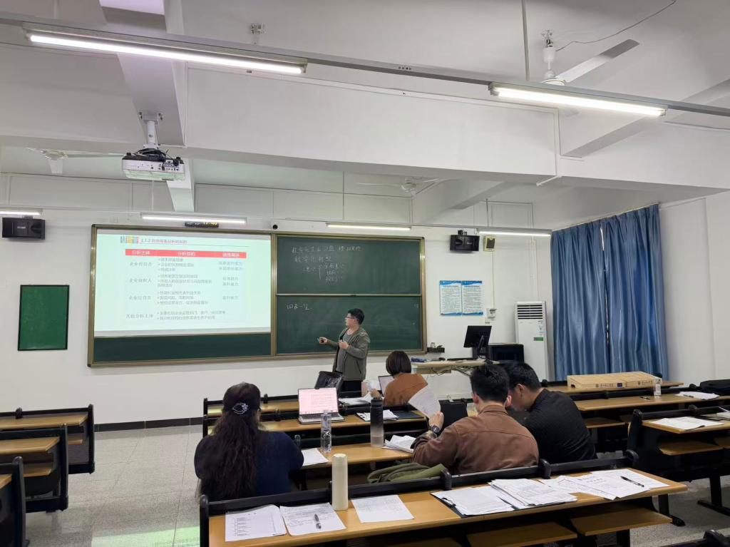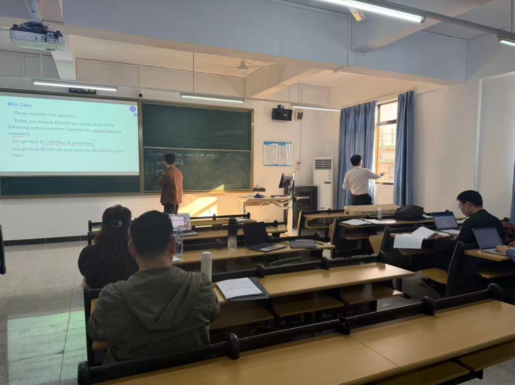 磨课研讨是本次工作坊的核心环节。为充分发挥示范引领作用,吴丽琴、吴昱含、苏培添、荣红涛四位老师依次进行现场授课展示;吴丽琴老师围绕财务管理的第三章货币时间课程进行授课展示,吴昱含老师以Financial Management(财务管理)第三章Time Value of Money开展教学演示,苏培添老师则带来企业沙盘模拟经营的实战教学,荣红涛老师聚焦财务报表分析第二章的分析原理展开课堂讲解。