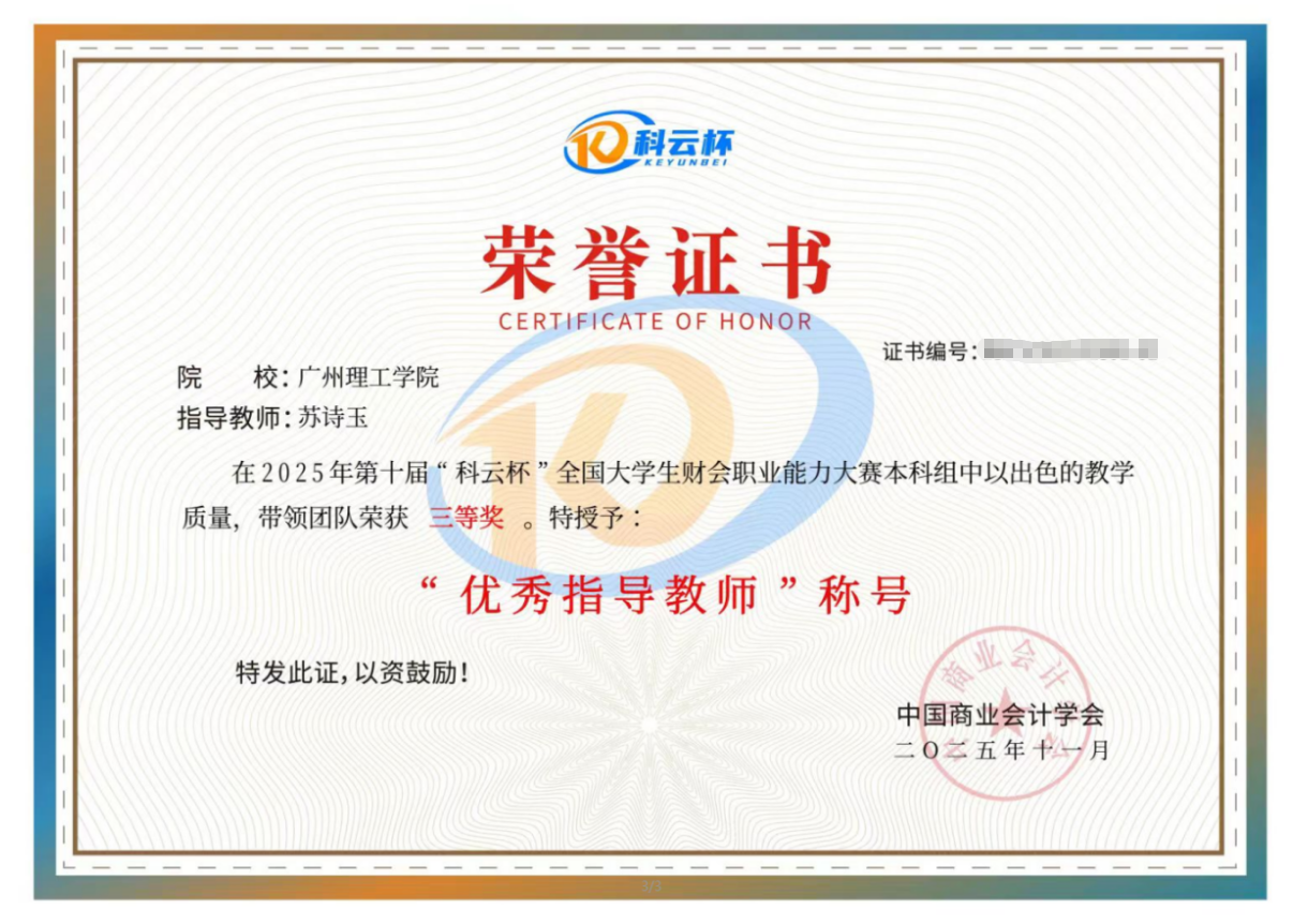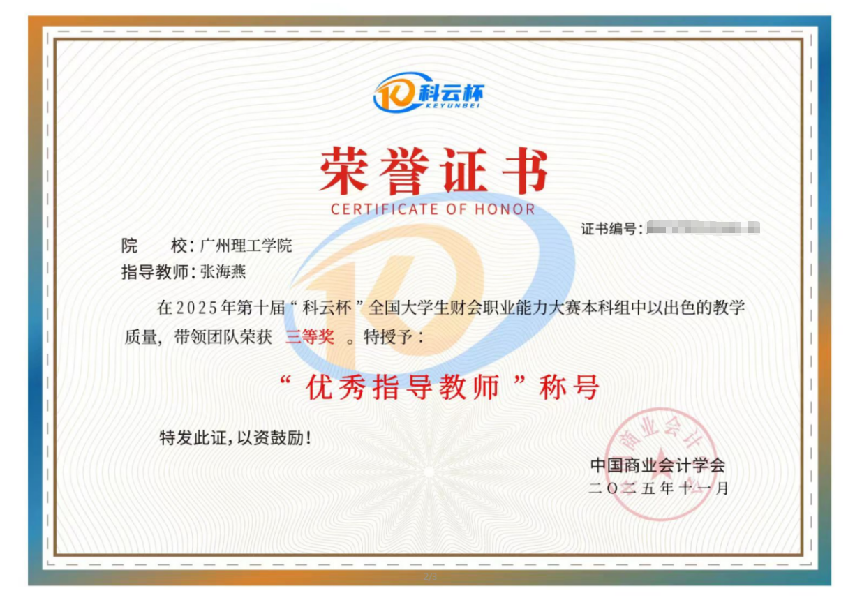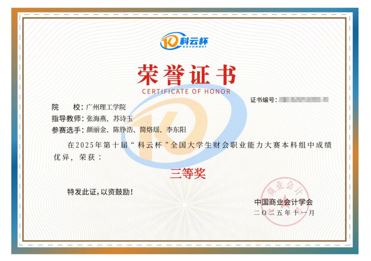 本次赛事中,学院高度重视、精心筹备,组织专业教师团队为参赛学子开展系统性指导与针对性训练,助力学生夯实专业基础、提升实战能力。在各位指导老师的悉心带领下,参赛团队刻苦钻研、反复演练,在赛场上沉着应战、默契配合,最终在众多参赛队伍中脱颖而出。由张海燕和苏诗玉老师带队指导由颜丽金、陈铮浩、简烙瑶、李东阳同学组成的“财智攻坚”团队荣获省赛三等奖。参赛队伍的优异表现,充分彰显了学院学子过硬的财会专业素养、高效的团队协作能力以及良好的问题解决能力。