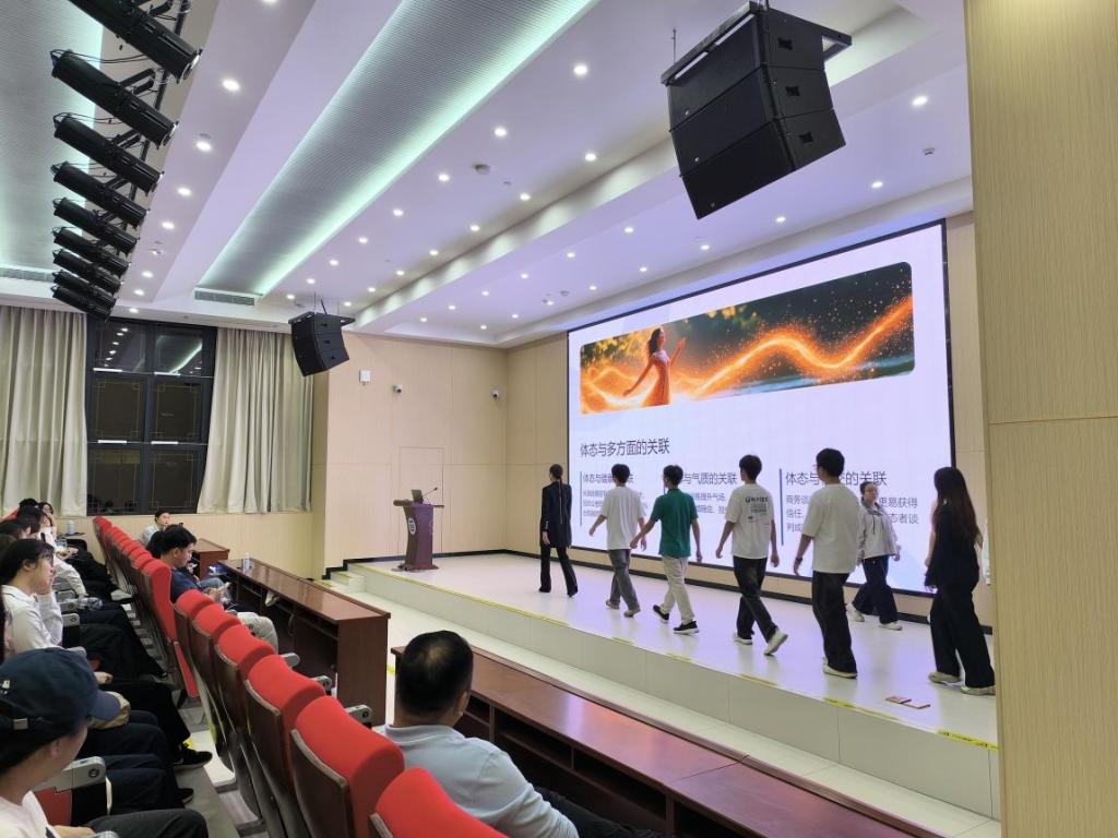 讲座伊始,黄悠老师直击核心,强调体态是一个人精神风貌的直观体现,是个人形象的重要基石。她通过生动案例对比不良体态与优雅体态的视觉差异,让同学们直观感受体态对个人形象的深刻影响。随后,她邀请多名学生上台互动,结合日常场景手把手指导体态调整技巧,从站姿到行走姿态逐一纠正,并现场演示如何通过细微调整展现自信大方的精神风貌,她的指导令同学们受益匪浅。