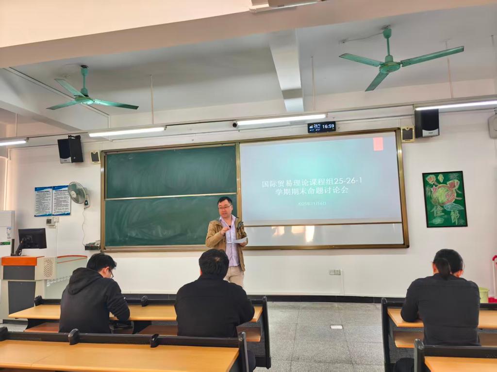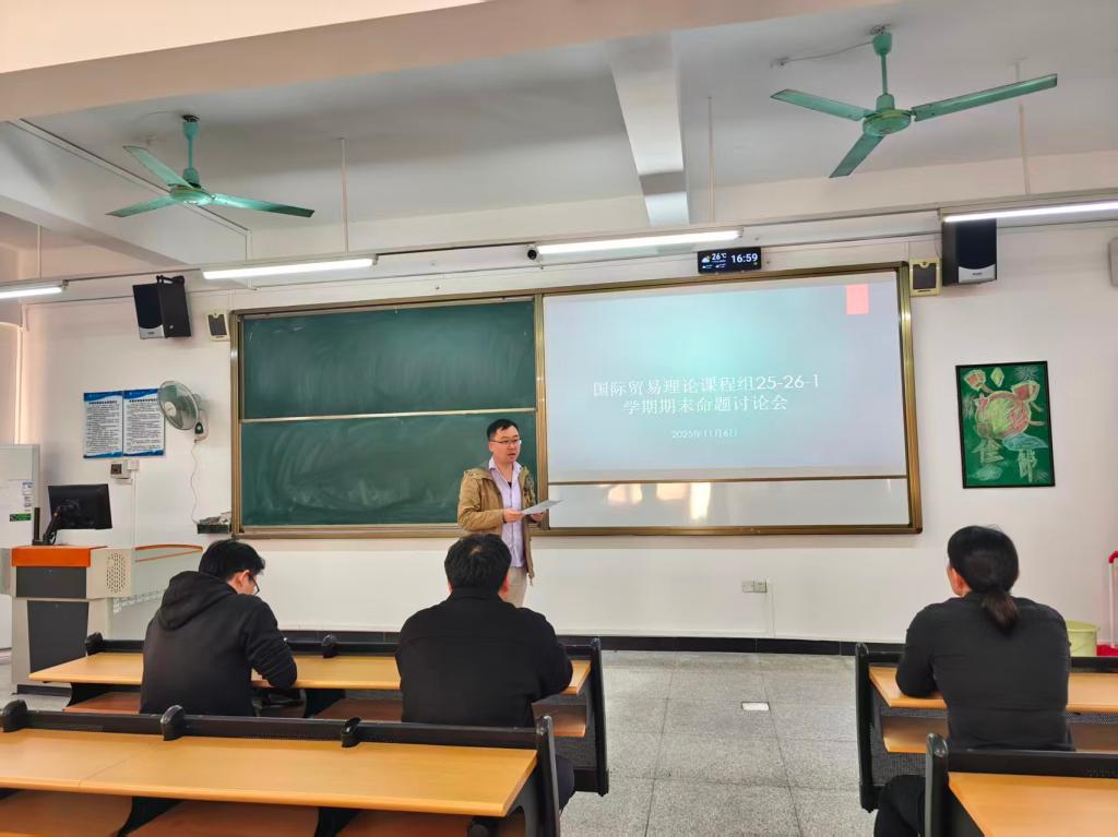 2025年11月6日下午,经济管理学院国际贸易理论课程组在1栋902召开了关于期末命题与学生考核方式的专题研讨会。会议由课程组组长孙春露主持,孔德毅、叶青、许旭等教师参会,围绕试卷命题规范、题型设计、评分标准及考核方式等问题展开深入讨论。